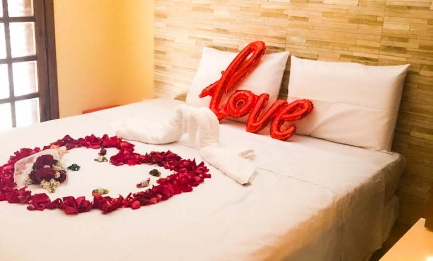 Suíte configurada com cama de casal, tv, ar condicionado, banheiro privativo, varanda com vista para o jardim e vista para piscina