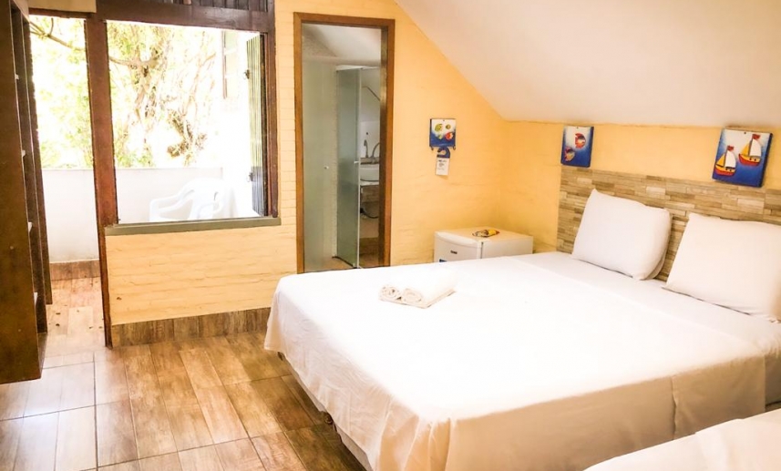 Essa suíte é composta por uma cama de casal + 01 cama adicional Tv de LCD 32 pol , Ar condicionado Split , Frigobar e banheiro Privativo. Possui uma varanda.